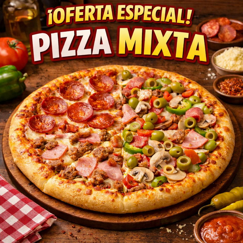 ⭐ DESTACADONuestra especialidad🍕 Pizza mixtaCrujiente, sabrosa y única. Un sabor que no encuentras en otro lugar.